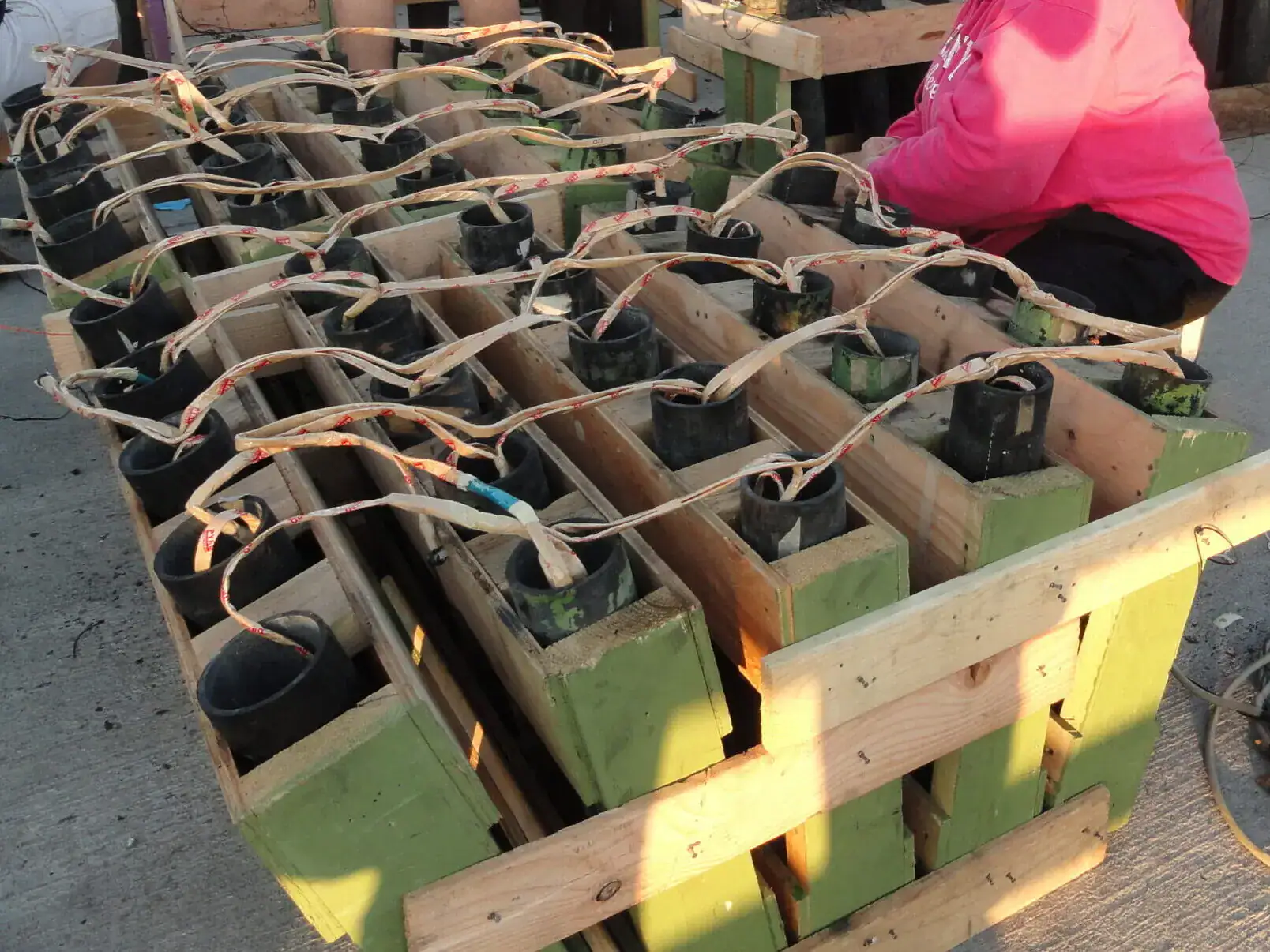 Keep Your Shells Untangled – Each shell will be branched off of the main quick match lead in a finale chain. Make sure you keep each shell in the order that it is attached to the chain. This will help prevent quick match blowouts during the show. When quickmatch fires, it’s so violent that it pretty much explodes as it’s “burning.” Tuck exceed quickmatch into the mortars so that you don’t chance having a piece of match belonging to a shell that has yet to get fired being blown apart from being tangled over another mortar.